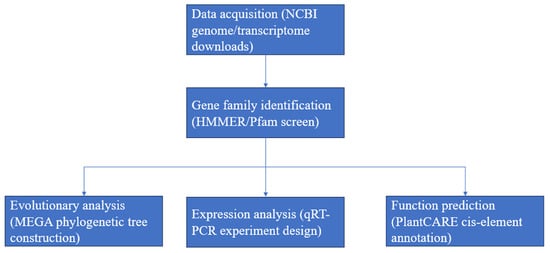 Research technical route. From genomic data acquisition (NCBI) → HMMER gene screening → MEGA evolutionary analysis → PlantCARE promoter prediction → qRT-PCR validation. Arrows are bioinformatics steps, and blue arrows in the image are experimental validation.