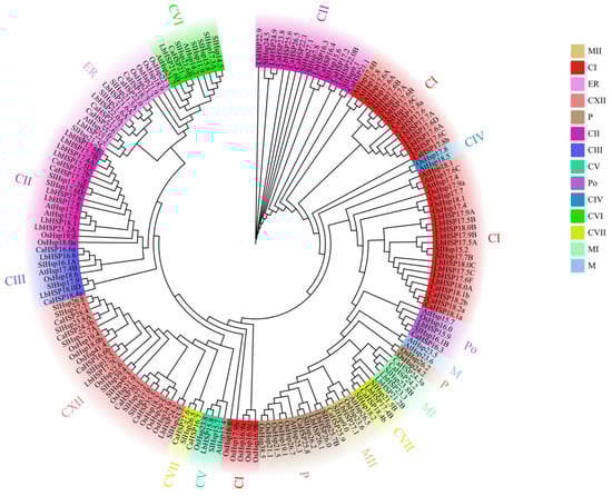 To investigate the evolutionary relationships of the Hsp20 gene family in L. barbarum, Capsicum annuum, Solanum lycopersicum, Arabidopsis thaliana, and Oryza sativa, we performed multiple sequence comparisons of the amino acid sequences of 43 Hsp20 proteins in L. barbarum, 35 Hsp20 proteins in Capsicum annuum, 42 Hsp20 proteins in Solanum lycopersicum, 19 Hsp20 proteins in Arabidopsis, and 35 Hsp20 proteins in rice, and constructed a rootless phylogenetic tree. A total of 19 and 35 Hsp20 proteins in rice were subjected to multiple sequence comparisons of amino acid sequences, and a rootless phylogenetic tree was constructed (Figure 3). Based on the phylogenetic analysis, 174 Hsp20 proteins were classified into 14 different subfamilies, including 42 cytoplasmic type I (CI), 38 cytoplasmic type II (CII), 8 cytoplasmic type III (CIII), 2 cytoplasmic type IV (CIV), 4 cytoplasmic type V (CV), 9 cytoplasmic type VI (CVI), 7 cytoplasmic type VII (CVII), 2 mitochondrial types (M), 5 mitochondrial I (MI), 5 mitochondrial II (MII), 13 plastid (P), 5 peroxisomal (Po), and 15 endoplasmic reticulum (ER). Phylogenetic analyses showed that most Hsp20 members (including 29 StHsp20s) were classified into the CI-CVII subfamily, suggesting that cytoplasmic lysosomes may be the main functional compartment of plant Hsp20. Notably, LbHsp20 members were more closely related to members of the same subfamily in different species than they were to other Hsp20 members within the same species, a phenomenon that suggests a high degree of covariance between members of the same Hsp20 subfamily across species and implies that these genes may have undergone conserved functional divergence during evolution.