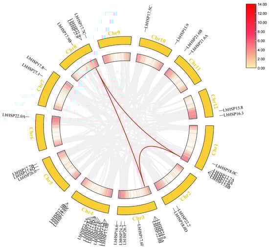 Chromosomal localization and covariance analysis of the LbHsp20 gene. Chromosome distribution map: distribution of Hsp20 genes on LBP chromosomes, numbers indicate gene positions; intragenomic covariance: red lines connecting Hsp20 gene pairs with covariance, highlighted; red lines in the boxes represent gene densities.