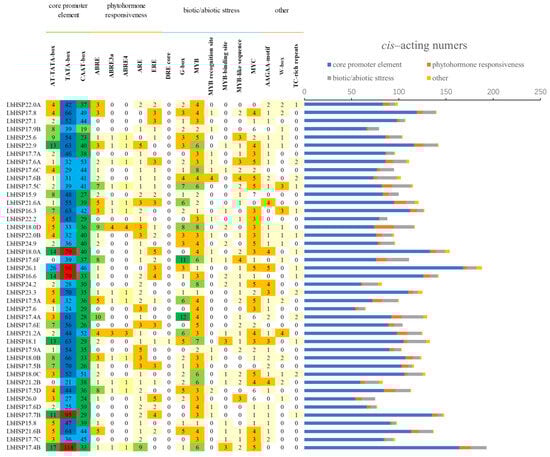 Promoter cis-acting elements, as key binding regions of transcription initiation factors, play a crucial role in the regulation of gene expression. In order to deeply investigate the potential biological functions of the 43 LbHsp20 genes, this study systematically predicted the cis-acting elements in the 1 kb promoter region upstream of the corresponding genes using the PlantCARE database (as shown). The analysis results showed that, in addition to the core promoter elements such as TATA-box and CAAT-box, a variety of specific cis-acting elements related to hormone response, adversity stress, and tissue and organ development were identified, which may play important regulatory roles in the activation and induction of LbHsp20 gene expression (Figure 5, Supplementary Materials).