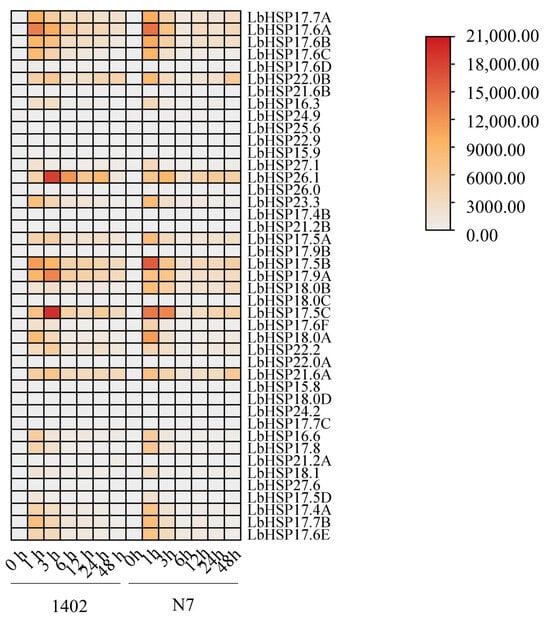 To better understand how the LbHsp20 gene family is controlled under high temperatures, we measured the levels of 43 LbHsp20 genes in the leaves of two types of plants (N7 and 1402) using a method called qRT-PCR in this study (Figure 6, Supplementary Materials). The experiment included three separate tests using different samples and two repeated tests to make sure the results were reliable and could be repeated. The results showed that the LbHsp20 gene family in both lines exhibited significant heat stress response characteristics under continuous heat stress treatment at 42 °C. Among them, the majority of genes (e.g., LbHsp17.7A, 17.6A, 17.6B, 17.6C, 17.6D, 22.0B, 17.5B, 17.9A, 18.0B, 18.0C, 17.5C, 17.6F, 18.0A, 22.2, 17.5D, 17.4A, 17.7B, and 17.6E) showed significant response characteristics to heat stress in short-term heat stress (1 h), and this high expression state persisted until the end of the stress treatment. In contrast, LbHsp24.9, 22.0A, and 15.8 showed a down-regulated expression pattern. Notably, genes such as LbHsp22.9, 17.9B, 15.8, 18.0D, 24.2, 17.7C, and 27.6 did not show significant expression differences before and after heat stress treatment. In addition, comparative analysis showed that the overall expression levels of the two lines of L. barbarum were different after heat stress treatment, suggesting that there may be different heat stress response mechanisms between the different lines, providing a basis for comparing their heat tolerance. These findings provide an important experimental basis for further elucidating the molecular mechanism of the LbHsp20 gene family in plant heat stress responses.