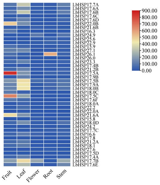 This research focused on examining the expression of the LbHsp20 gene family across various plant tissues—roots, stems, leaves, flowers, and fruits—utilizing the qRT-PCR technique (Figure 7). The results showed that the family members showed significant spatial expression heterogeneity: LbHsp22.0B, Hsp17.5A, LbHsp17.5C and LbHsp21.6A were specifically highly expressed in fruits, suggesting that they may be involved in the regulation of fruit development or ripening; LbHsp26.1 had a significant expression dominance in the roots, while LbHsp17.5B had the highest transcriptional had the highest abundance. Notably, although LbHsp17.7B, LbHsp17.5B, and LbHsp24.9 showed localized expression characteristics in flowers, most of the family members (e.g., LbHsp17.4A and LbHsp22.0B) were expressed at significantly lower levels in this tissue than in other tissues. Of particular importance, LbHsp17.5B maintained a constitutively high expression pattern in all tissues tested, suggesting that it may play a central role in the maintenance of basal cellular homeostasis. These findings reveal the functional differentiation of this Hsp gene family in different tissues of LbHsp and provide an important basis for resolving its molecular regulatory network.