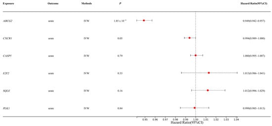 Estimation of causal effects of selected genes on urate levels (IVW: Inverse Variance Weighted method; Hazard Ratio (95% CI) = OR; The Red spots represent the OR values).