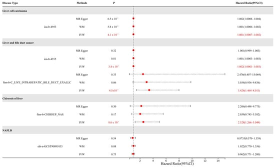 MR results for ABCG2 expression in liver diseases. The causal relationships that have a p-value < 0.05 are marked in red (MR-Egger: Mendelian randomization-Egger; WM: weighted median).
