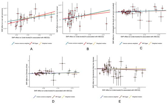 We first extracted SNPs from eQTL databases (https://www.eqtlgen.org/cis-eqtls.html, accessed on 1 January 2025) as instrumental variables to evaluate the causal relationship between the selected upregulated/downregulated genes and urate levels. Among the 21 candidate genes, we identified 6 genes with available genetic instruments. The IVW method revealed that only ABCG2 demonstrated a significant causal association with urate levels (p < 0.01) (Figure 1), consistent with the previous reports linking ABCG2 genetic variants to urate metabolism. The specific SNPs used for each gene are shown in Table S7. Subsequently, we employed a drug-target Mendelian randomization analysis to estimate the causal relationship between ABCG2 variant-mediated uric acid levels and liver diseases.