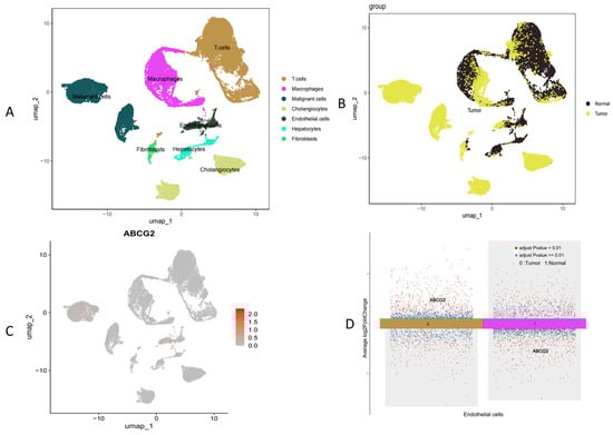 We found that overall ABCG2 expression was downregulated in the TCGA (CHOL/CCA) dataset. We found that single-cell analysis (GSE138709) revealed that ABCG2 expression in specific cells, such as endothelial (Figure 4D) or malignant tumor cells (Figure 4C), was increased compared to the normal group. However, that overall ABCG2 expression was downregulated in the TCGA (CHOL/CCA) datasets (Figure S2). This discrepancy may be due to different sampling approaches.