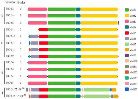 Conserved motif analysis of FtCHS proteins. Various conserved motifs are indicated by distinct colors. The labels I, II, III, and IV on the left side of the image correspond to FtCHS proteins in phylogenetic groups I, II, III, and IV, respectively.