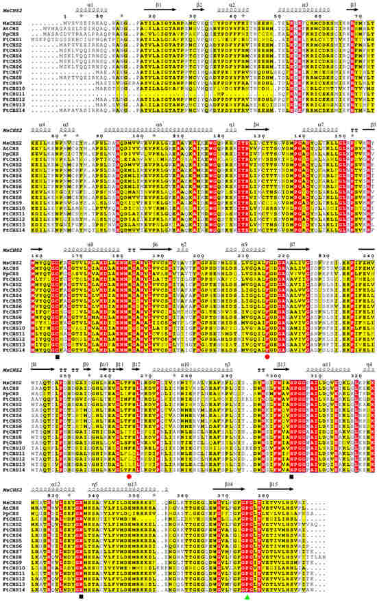 Multiple sequence alignment of FtCHS proteins in comparison with CHSs from other plants. The secondary structure of MsCHS2 is depicted in the top line, where red segments highlight strictly conserved sequences. α−helices are indicated by black wavy lines, while β−sheets are denoted by black arrows. At the bottom, black squares highlight the Cys−His−Asn (CHN) catalytic triad, while red dots indicate CoA−binding residues, and green triangles emphasize the CHS family−specific Pro375 residue. Protein sequences for M. sativa MsCHS2 (AAA02824.1), A. thaliana AtCHS (AAA32771.1), and P. patens PpCHS (ABB84527.1) were obtained from the GenBank.