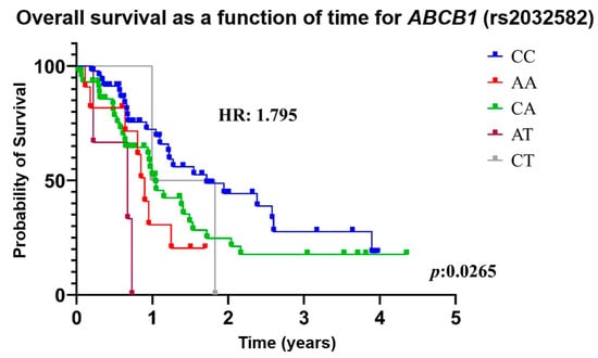 For the ABCB1 rs2032582 (c.2677A>C/T) variant, our study revealed an association between non-AA genotypes (namely, the AT/CC/CA/CT genotypes) and worse OS, which was further confirmed in the multivariate analysis. Likewise, the c.2677AA genotype was associated with a longer OS in Belgian patients with ovarian cancer treated with paclitaxel and carboplatin [53]. In Korean and Indian cohorts, CC/CT/TT genotypes were associated with a lower progression-free survival (PFS) compared to AA/AC/AT genotypes, but not with OS [27,36]. Therefore, the contribution of ABCB1 rs2032582 to the risk of chemotherapy-induced ADRs needs to be further investigated.