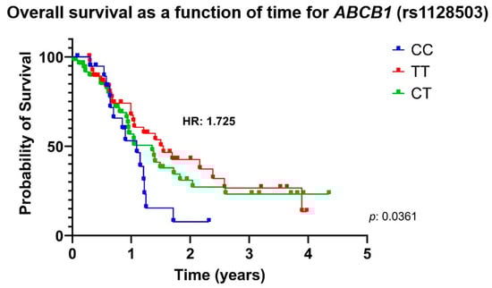 In our study, patients with the ABCB1 rs1128503 (c.1236C>T) CC+CT genotypes had a higher risk of developing nausea and vomiting. A previous study reported different results, as the CT genotype was associated with a reduced risk of nausea or vomiting compared to the TT genotype [39]. Furthermore, ABCB1 rs1128503 CT and CC genotypes were associated with lower OS in our cohort. Similarly, other studies found that the TT genotype, alone or in a haplotype, was associated with longer OS [46,47,48,49,50]. Additionally, variants in the ABCB1 gene have been associated with the response to taxane-based treatment. In particular, the ABCB1 rs2032582 and ABCB1 rs1045642 variants have been correlated with a partial response to these agents, suggesting a potential functional impact of these variants on therapeutic efficacy [10].