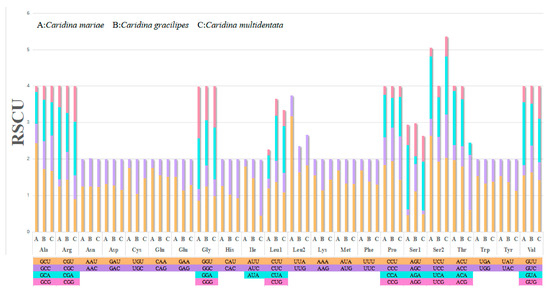 Codon usage of three rice shrimp species (A: C. mariae, B: C. gracilipes, and C: C. multidentata).