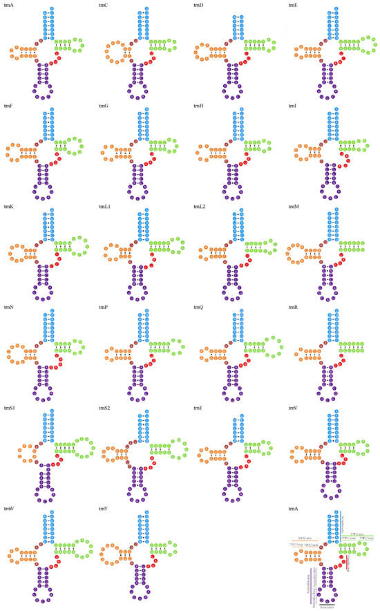 The mitochondrial genome of C. mariae encoded 22 tRNA genes, each of which was predicted to fold into the secondary structure of the leaves of cloverleaf. The tRNAs varied in size from 62 bp (trnR) to 70 bp (trnW and trnS2) (Table 1). This could be attributed to evolutionary rate variation. Additionally, it was worth mentioning that tRNAs contain a multitude of basic mismatches, including 31 GU mismatches, 1 CC mismatch, 2 UU mismatches, 2 CA mismatches, and 3 UC mismatches (Figure 3).