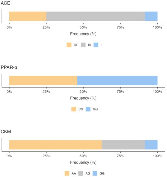 Percentage of the genotype distribution for the three gene variants. ACE: Angiotensin I Converting Enzyme; PPARα: Peroxisome Proliferator-Activated Receptors; CKM: Creatine Kinase Muscle-Type.