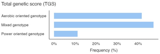 Figure 1 shows the percentage of the genotype distribution for the three gene variants in the whole sample; different colors emphasize the genotype that predisposes the athletes to the specific activity. Additionally, considering the total GS calculated by summing the GS of the allelic distribution for all three genes, it is pointed out that the sample scored a higher mixed-oriented genotype of 47% (Figure 2). The athlete’s survey results showed that they spent an average of 367.3 ± 153.1 min weekly in technique training, 188.5 ± 122.3 min in strength training, and 134.8 ± 95.5 min in aerobic training (Figure 2).
