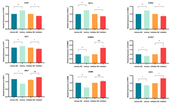 As shown in Figure 5C,D, compared to the mimic NC group, overexpression of miR-143-3p in T cells significantly increased the proportion of the TSCM (p < 0.05) and TCM subset (p < 0.01), while the proportions of the TEM and TEFF subsets significantly decreased (p < 0.05). In contrast, compared to the inhibitor NC group, inhibition of miR-143-3p expression in T cells significantly decreased the proportion of the TSCM (p < 0.001) and TCM subset (p < 0.05), while the proportions of the TEM and TEFF subsets significantly increased (p < 0.01).
