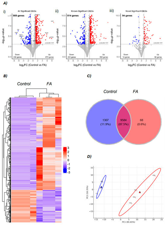 Visualization of differentially expressed genes. (A) Volcano plots of differentially expressed genes (DEGs): (i) all significant DEGs, (ii) known DEGs, and (iii) novel DEGs. Red and blue dots indicate upregulated and downregulated genes in FA-treated embryos compared to controls, respectively. (B) A cluster heatmap of DEGs, based on z-score between control and FA group, read color shows upregulated genes and blue color shows downregulated genes pattern. (C) Venn diagram of overlapping of all genes in this experiment. (D) Principal component analysis (PCA) plot illustrates the clustering of groups based on their principal components, control (blue) and the FA group (red).