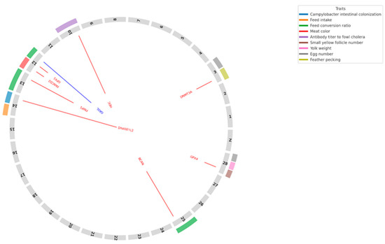 Circular visualization of key differentially expressed genes (DEGs) mapped onto chicken chromosomes alongside relevant QTL (Quantitative Trait Loci) traits. DEGs are shown as colored lines corresponding to their chromosomal positions. Red and blue lines represent upregulated and downregulated genes, respectively, in the FA-treated group compared to controls. Colored blocks on the outer ring denote the chromosomal locations of QTLs associated with economically important traits, including immune response, feed efficiency, and reproductive traits. Trait categories are indicated by color, as defined in the legend box.