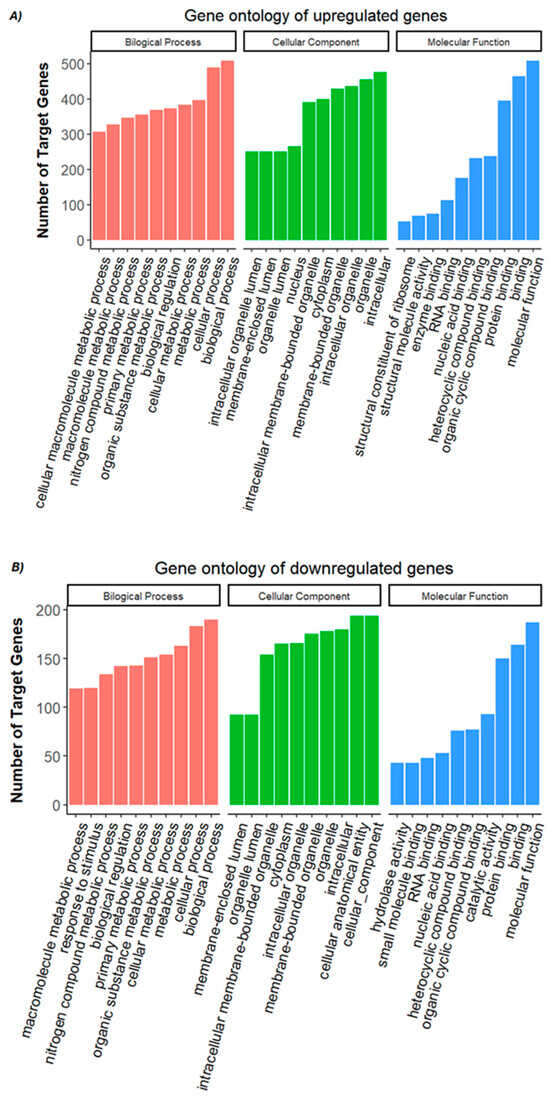 Top ten enriched Gene Ontology (GO) terms for (A) upregulated and (B) downregulated genes identified in FA-treated versus control embryos. GO terms are categorized into three main domains: biological process (red), cellular component (green), and molecular function (blue). Enrichment analysis was performed based on statistical significance, and the top ten terms in each category were ranked by p-value < 0.05.