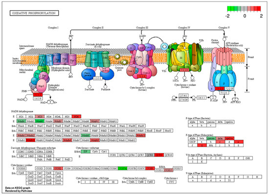 Analysis of oxidative phosphorylation KEGG pathway rendered by Pathview package in R, log2 (fold change) differences in DEGs in FA group are represented by colors: red color denotes upregulation and green color denotes downregulation.