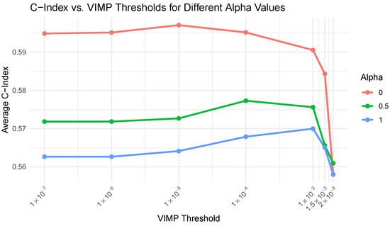 We then systematically optimised the feature VIMP threshold, for which we selected the features to train the regularised Cox model. For each threshold value, the C-index was computed and averaged across the 10 replicates, with regularisation strengths defined by values (0 for Ridge, 0.5 for Elastic Net, and 1 for LASSO). The results, summarised in Figure 2, show that although the C-index slightly decreased when the VIMP threshold increased from 0.0001 to 0.001, the performance loss was modest compared with the substantial gain in the model sparsity. A threshold of 0.0001 resulted in 758.4 ± 169.3 selected features, whereas 0.001 reduced this number to just 59.3 ± 12.7. On average, this threshold retained only 2.5% of the features previously pre-selected by univariate Cox regression, which reduced the number from approximately 2345 ± 813.9 to a compact yet informative subset. This simplification improved the model interpretability while preserving the strong predictive performance across all regularisation settings. Therefore, the 0.001 threshold was selected as the most appropriate cut-off point for downstream model training.