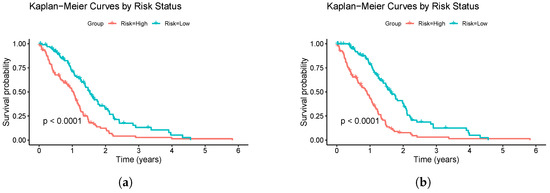 Kaplan–Meier survival curves for high-risk and low-risk groups based on models trained on the entire dataset. The survival outcomes predicted by the (a) Elastic Net–Cox trained with the Boruta-selected features and (b) Ridge–Cox trained with the RSF-selected features. The risk groups were defined by the median risk score, with the curves reflecting the survival trends across the entire dataset. The statistical significance of the group differences was evaluated using the log-rank test.