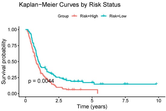 To assess the generalisability of the selected genes beyond the TCGA dataset, we conducted an external validation using the Chinese Glioma Genome Atlas (CGGA). The expressions of the nine genes listed in Table 2 were extracted and used to fit a multivariate Cox regression model. The PI (Equation (2)) derived from this model was then used to stratify patients into high- and low-risk groups based on the median PI value. The Kaplan–Meier survival curves revealed a statistically significant difference in the overall survival between these two groups (p-value = 0.0044, log-rank test), as shown in Figure 5.