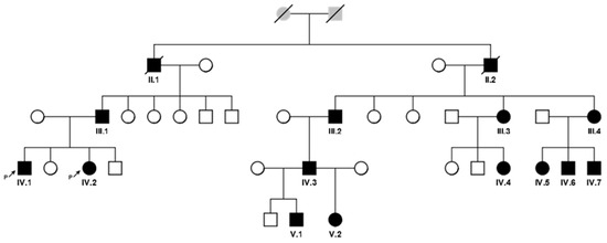 A pedigree of the family with 13 OI patients in 4 generations (affected individuals are colored with black and signed with Roman and Arabic numerals according to the position in the pedigree).