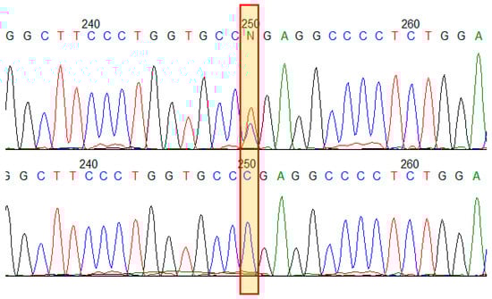 Results of Sanger sequencing of the COL1A1 gene exon 19 in the family. Electropherograms demonstrate the variant NM_000088.3(COL1A1):c.1243C>T p.(Arg415Ter) in a heterozygous state in an affected family member (upper) and in a healthy one (bottom).