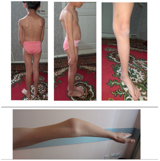 In some cases, the clinical manifestation of OI may differ from the expected one, which can be explained by mosaicism due to a de novo mutation. In other cases, it may be a coincidence of two or more pathogenic variants in the same patient. [24]. Nevertheless, even without mosaicism or other pathogenic genetic variants, the variety of OI symptoms within one family can be considerable [11]. The clinical variability of OI has not yet been fully explained. Though descriptive analysis was not possible due to a small number of patients of the same age in each nuclear family, distinct intrafamilial polymorphism of OI symptoms and their severity was observed. For example, child IV.5 (at the time of examination at 1 year) had only one symptom (dark blue sclerae). Other patients showed a more extended picture of the disease. Patient IV.4, a girl of 8 y.o., demonstrated severe scoliosis, flat feet, and joint hypermobility (Figure 3).