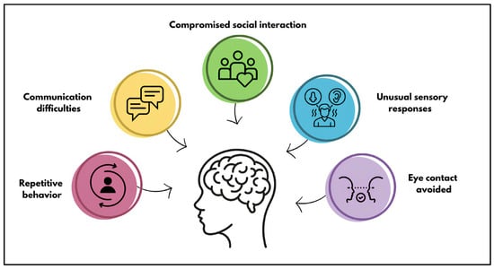 Autism spectrum disorder (ASD) is a complex neurodevelopmental condition with onset during early development that is characterized by a range of conditions and symptoms, especially social and communication deficits, repetitive behaviors, and restricted interests; it varies from person to person not only in terms of symptoms and severity, but also in terms of the different subtypes of ASD (e.g., autistic disorder, Asperger’s syndrome, and pervasive developmental disorder not otherwise specified) [1,2,3,4,5,6]. The Diagnostic and Statistical Manual of Mental Disorders (DSM-5) (American Psychiatry, APA, Philadelphia, PA, USA, 2013), currently used for the diagnosis of autism, attributes the definition of “spectrum” to the condition of autism and uses criteria derived from diagnostic research assessment tools [7]. ASD has a prevalence of 1 in 160 children, with an increasing trend according to the World Health Organization (WHO) [8,9,10]. It is one of the most common groups of neurodevelopmental disorders (NDDs) and affects approximately 1–2% of the population [11,12,13]. ASD has an average male-female ratio of 4–5:1, showing an unequal distribution by gender [14,15,16]. Sex-differential biological factors and pathways that may account for the observed female protection and increased male risk in autism, predicted by the female protective effect model, are believed to involve the regulation and exposure to sex steroid hormones, as well as sex-differentiated activity in certain neural cell types [17]. According to Badcock et al., the key to understanding the variation in the sex ratio of ASD lies in the concept that both sexes possess maternal and paternal brains. ASD can arise either from the deterioration of the maternal brain (with a normal or enhanced paternal brain) or from the amplification of paternal brain effects (with a normal maternal brain). The deterioration of the maternal brain is expected to lead to more severe, “classic” ASD, often involving intellectual disability and language loss. In contrast, a normal maternal brain combined with enhanced paternal brain effects on cognition and behavior may result in “high-functioning” ASD or Asperger’s syndrome [18,19]. This agrees with Baron-Cohen’s extensive evidence on gender differences that describes males normally showing a bias towards stronger paternal brain effects, which predisposes them to ASD [19]. The intellectual disability and loss of language characteristic of classic ASD fit this prediction, but also necessarily generate a profound loss of phenotypic traits, making further evaluation in this context difficult, which is why further studies are underway [18,20]. In recent years, there has been growing interest in exploring the potential need for sex-differential diagnostic criteria for ASD [21]. As indicated in the DSM-5, individuals with ASD are characterized by persistent deficits in communication and social engagement, as well as restricted and repetitive patterns of behavior, interests, or activities. Specifically, deficits may be observed in areas such as social-emotional reciprocity, nonverbal communication behaviors used in social interactions, and the ability to establish, maintain, and understand age-appropriate relationships. According to the DSM-5, symptoms may be masked during early development and fully appear only when social demands exceed limited capacities or may be hidden by learned strategies in later life (Figure 1).