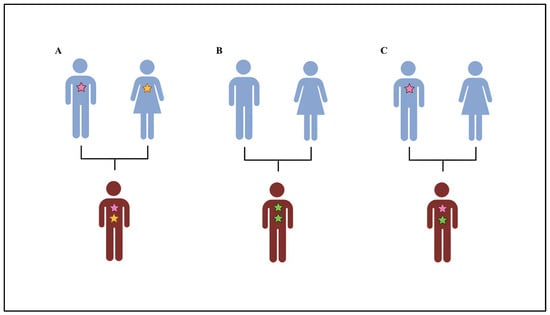 Double hit model. The risk of ASD can be caused by the presence of (A) two inherited alterations: one of paternal origin and one of maternal origin. (B) Two de novo alterations. (C) Two alterations: one de novo and one of parental origin.