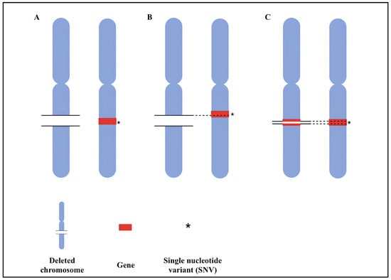 Different compound heterozygosity mechanisms. (A) The gene is completely included in the deletion, and an SNV is present on the other allele. (B) The gene is partially included in the deletion, and an SNV is present on the other allele. (C) Presence of an intragenic deletion and an SNV on the other allele.