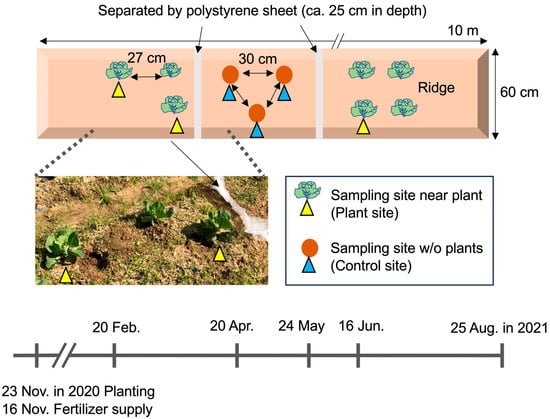 Experimental field sites and schedule of soil sampling. Cabbage was cultivated in the field in the campus of Toyohashi University of Technology from November 2020 to August 2021. The cultivated area was separated from the uncultivated area by a polystyrene sheet (approximately 25 cm in depth). Chemical fertilizer was only supplied to tilled soils prior to cultivation. Soils were isolated from the three sampling sites near the crops (plant sites) and three sampling sites in the unplanted area (control site) on the indicated dates (20 February, 20 April, 24 May, 16 June, and 25 August). The photo was taken on 20 April 2021.