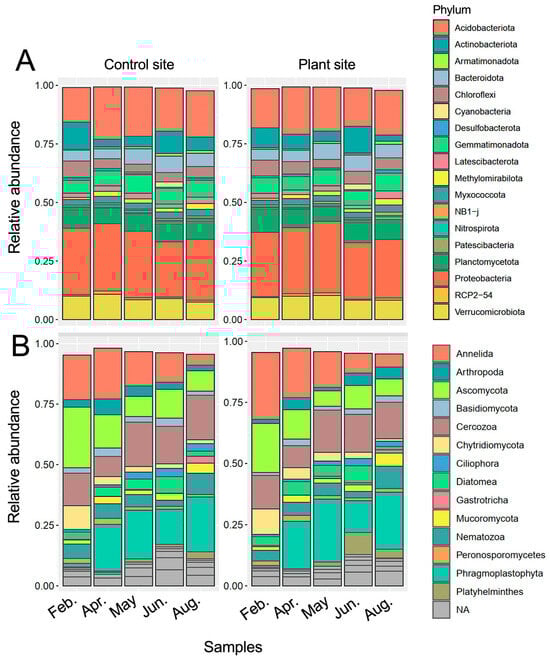 Phylum compositions of prokaryotes and eukaryotes at the control and plant sites during cultivation are shown in Figure 2A,B, respectively. The prokaryotic phylum compositions at both sites were comparable and showed similar changes throughout the study period. The relative abundances of abundant SVs from two major phyla, Acidobacteriota and Proteobacteria, increased in April and then decreased, and Actinobacteriota-derived abundant SVs tended to exhibit contrasting profiles (Supplementary Table S1; Supplementary Figure S2A–C). Cyanobacteria-derived SVs were abundant in June (Supplementary Figure S2K). The eukaryotic phylum compositions of the samples markedly changed over time; for example, the fractions of Annelida decreased and those of Phragmoplastophyta increased in total eukaryotes during cultivation (Figure 2B). The relative abundances of fungi, protists, and animal-derived SVs were further investigated in the samples (Supplementary Figure S3). In fungi, the fractions of the phylum Ascomycota were the most abundant in total eukaryotic SVs, and the increase and decrease in Mucoromycota- and Chytridiomycota-derived SVs, respectively, were notable. SVs derived from the phyla Cercozoa and Annelida were the most abundant among protist- and animalia-derived SVs, respectively (Figure 2B). The phylum compositions of fungi- and protist-derived SVs were comparable between the samples from the control and plant sites, whereas those of animals, such as Annelida, changed differently between sites (Supplementary Figure S3). A detailed taxonomic analysis of eukaryotic SVs is described in the following section.