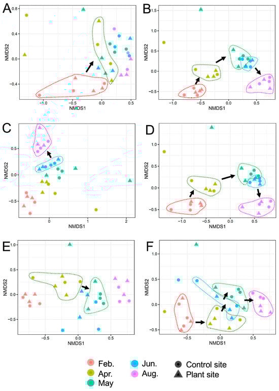 We further analyzed changes in α-diversities based on the Shannon index and β-diversities based on the Bray–Curtis distance in the samples. The Shannon indices for prokaryotes, eukaryotes, fungi, protists, animals, nematodes, and plants are shown in the Supplementary Figure S4A–G, respectively). The α-diversity of nematodes in animals was analyzed because they represent a suitable indicator for assessing the soil environment []. The indices changed differently among taxonomic groups, and differences in the indices were also found between the control and plant sites. The Shannon indices in six groups, except for plants, tended to increase during the period, especially those in animals at plant sites, and significantly increased from February to August (Tukey–Kramer test, p < 0.01) (Supplementary Table S2, Supplementary Figure S4E). In particular, the Shannon indices of plant-removed eukaryotes showed an increase in eukaryotic SVs (Supplementary Figure S4H). The β-diversity plots of prokaryotes, eukaryotes, fungi, protists, animals, and nematodes are shown in Figure 3A–F, respectively. Unlike the prokaryotic plots assigned to two groups (February and others) (Figure 3A), those of eukaryotes, fungi, protists, and animals were separated into 2–5 clusters based on the cultivation period (Figure 3B–E). The Bray–Curtis distances of several pairs of consecutive samples were found to be significantly different by the pairwise.adonis2 test (p adjusted < 0.05) (Supplementary Table S3). In Figure 3, these sample groups are surrounded by dotted lines and an arrow, indicating the change in the corresponding communities. These data suggest that eukaryotic communities such as fungi, protists, and animals significantly change during cultivation.