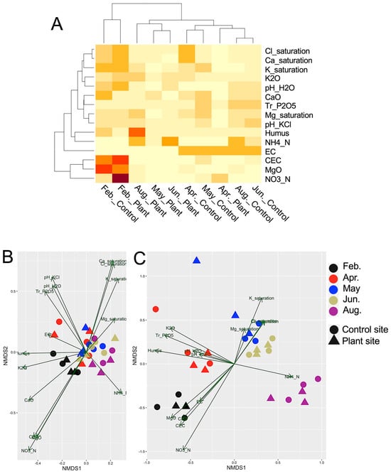 The heatmap of 15 chemical parameter values in the soil samples indicated high nitrite nitrogen, exchangeable magnesium, and cation-exchange capacity in February’s soils, presumably because of the initial fertilizer supply prior to cultivation (Figure 4A). To investigate the association of the samples with the chemical parameters, the five sample groups were clustered according to the chemical parameters determined by RDA, and the resultant plots of prokaryotic SVs were not associated with any parameters (Figure 4B). In contrast, the plots of eukaryotic SVs indicated the associations of the SVs in February with the above parameters whose contents were high in February’s soils; those in April with phosphorus and humus contents; those in May and June with potassium, magnesium, and chloride saturations; and those in August with the ammonium nitrogen content (Figure 4C), also suggesting dynamic changes in eukaryotic communities.