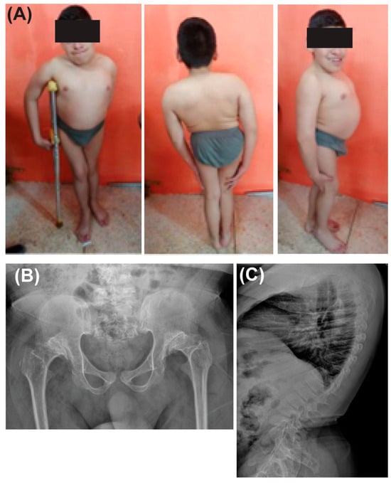 At the time of referral (age 17), his height was measured at 137 cm (−3 standard deviations, −3 SD), and he weighed 42 kg, corresponding to a BMI of 22.4. He also presented with microcephaly (an occipitofrontal circumference of 45 cm). Physical examination revealed coarse facial features, macroglossia, mandibular prognathism, a short neck, a disproportionately short trunk, and pectus carinatum. Additional findings included spinal and hip deformities, thoracic kyphosis measuring 62 degrees, bilateral pes planus, upper limb deviations, and an unsteady gait with hip adduction and restricted movement (Figure 1). Cognitive evaluation using the Wechsler Adult Intelligence Scale (WAIS-IV) revealed an IQ of 68, consistent with mild intellectual disability, manifesting as restricted and repetitive language use. No formal body composition or functional handgrip assessments were performed. To ensure phenotypic precision, Human Phenotype Ontology (HPO) terms and corresponding codes for the clinical findings were documented (Table S1).