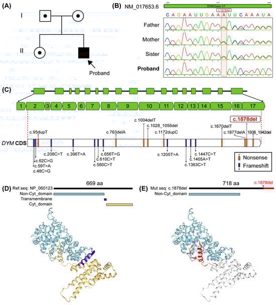 Family pedigree, genetic, and protein analysis of the reported case. (A) Pedigree illustrating the autosomal recessive inheritance pattern and the family members studied during the initial genetic evaluation. (B) Electropherogram showing the c.1878delA variants in DYM: the proband is homozygous for the deletion, whereas the father, mother, and sibling are heterozygous carriers. (C) Schematic representation of the DYM gene (green boxes denote exons). The transparent box highlights the coding region, showing the distribution of frameshift variants (orange boxes) and nonsense variants (purple boxes) previously reported worldwide in individuals with DMC syndrome. (D) Predicted functional domains of the DYM reference sequence. The in silico analysis identifies non-cytoplasmic (blue), transmembrane (purple), and cytoplasmic (yellow) domains. (E) DYM protein sequence harboring the c.1878delA variants. In the mutated sequence, only the non-cytoplasmic domain (blue) is predicted by InterPro. The remaining regions, which are not annotated as functional domains, are shown in gray. The segment highlighted in red represents the portion of the reference sequence that is lost as a result of the frameshift variants and subsequent premature termination. This model was generated using the mutant sequence to illustrate the predicted structural consequences of the c.1878delA variant.