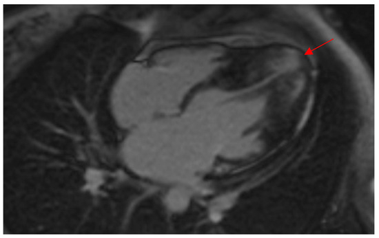 CMR demonstrates a thickened LV apex in a female patient of this study with wall thickness extending to the midventricular septum, indicating a “mixed ApHCM” (distal-dominant form). Note the presence of LGE in the hypertrophied apex (red arrow) as well as the apical aneurysm. ApHCM, apical hypertrophic cardiomyopathy; CMR, cardiac magnetic resonance imaging; LGE, late gadolinium enhancement; LV, left ventricular.