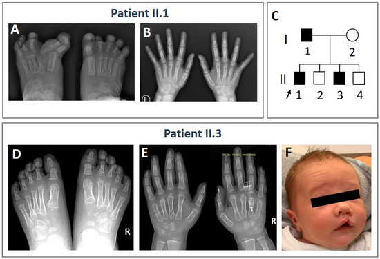 Clinical features observed in members of the affected family. (A) Spectrum of ectrodactyly of the left foot and synpolydactyly of the right foot diagnosed in the proband (II.1). (B) X-ray image of the unaffected hands of the proband (II.1). (C) The pedigree of the described family. The index patient is indicated by an arrow. (D) Bilateral deformities of the second and third metatarsals. (E) Irregular ossification centers in the hands of the proband’s brother (II.3). (F) Craniofacial malformations observed in the proband’s brother.