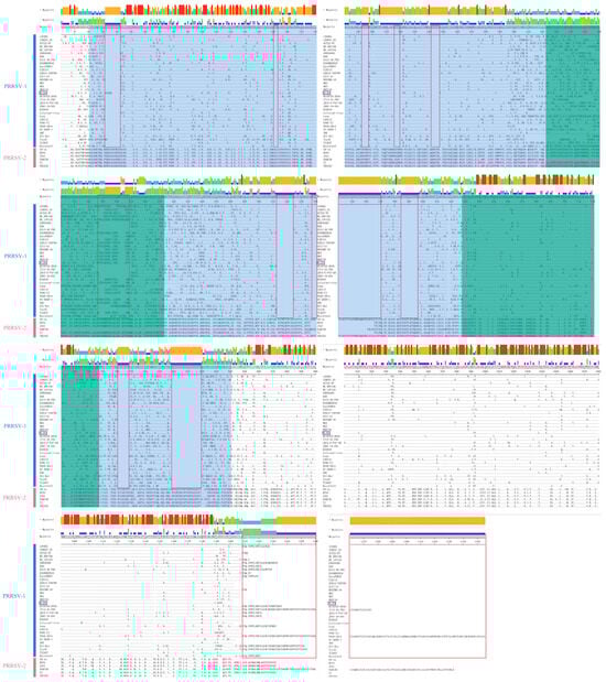 A distinctive feature of PRRSV is the excessive number of mutations, especially in the NSP2 gene, which displays various types of mutations such as deletion, recombination, and insertion, resulting in noticeable variations in the NSP2 proteins []. The similarity between the LV and VR2332 strains was only 40.0%. The CH-1a strain of PRRSV-2, first discovered in China, shares 80.0% similarity with NSP2 of the VR2332 strain from the United States. According to Zhang et al. [], the KZ2018 strain, which is also known as PRRSV-1, shares approximately 88.6% similarity with the LV strain and has 81.9–90.8% similarity with other PRRSV-1 strains found in China. Shen et al. [] studied the entire nucleotide sequence of the genomic RNA of vaccine strain SP. These findings revealed that the vaccine strain SP exhibited only 78.0% nucleotide sequence similarity with the European LV strain. The most significant variation was observed in the C-terminus of NSP2, wherein 36 and 155 amino acids were inserted. This insertion sequence did not show any similarity with equivalent arterial virus proteins. The notable differences in NSP2 among various PRRSV isolates indicate its potential utility as a marker to distinguish between PRRSV genotypes. Furthermore, NSP2 of the PRRSV-1 KNU-07 strain, which was initially isolated in South Korea in 2009, exhibited a deletion of 60 amino acids []. Consequently, NSP2 is commonly employed as a target gene to analyze the evolution of PRRSV. In this study, 25 Chinese PRRSV-1 NSP2 sequences and 44 foreign PRRSV-1 NSP2 sequences were obtained from the NCBI database and analyzed for genetic similarity. The findings indicated that the amino acid and nucleotide resemblance varied from 64.3 to 100.0% and 67.3 to 100.0%, respectively. Zhang et al. [] reported that the amino acid and nucleotide similarities in PRRSV-2 NSP2 ranged from 72.5 to 99.8% and 63.9 to 99.4%, respectively. The degree of variation in the amino acid sequence of PRRSV-1 NSP2 was higher than that of PRRSV-2 NSP2, but the degree of variation in nucleotide sequence was comparable to that of PRRSV-2 NSP2, which may be attributed to the accumulation of nonsynonymous mutations in some key loci of PRRSV-1 strains under the positive selection pressure and the occurrence of adaptive changes in genes in order to adapt to the epidemiology in China. In addition, the diversity of sample sources is also one of the important reasons affecting the results of gene sequence analysis, and samples from different countries and regions may have different genotypes and genealogical relationships under them. In our investigation, the analysis of amino acid sites between PRRSV-1 and PRRSV-2 NSP2 by aligning thirty-four PRRSV-1 and six PRRSV-2 NSP2 sequences indicated that PRRSV-1 NSP2 showed a higher number of deletion and substitution sites than PRRSV-2. In addition, PRRSV NSP2 has a highly immunogenic region, 21-840aa [,], which has multiple B-cell linear epitopes, and different parts of the region showed mutations and deletions of the locus. The results of the amino acid variation (Figure 1) showed that different strains had different degrees of variability in the hypervariable and hyperimmunogenic regions, which could be an adaptive evolution of PRRSV to facilitate immune escape and adaptation of the virus itself for better transmission. It can be seen that the deletion and mutation of amino acids in the NSP2 region of PRRSV-1 pose an obstacle to the effective use of existing vaccines but also provide new directions for the design of new vaccines.