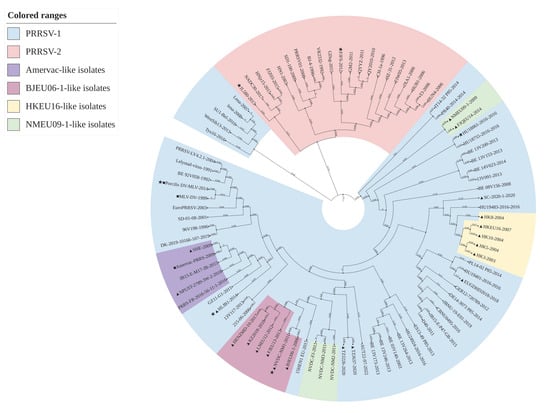 - Shi, M.; Lam, T.Y.; Hon, C.C.; Hui, K.H.; Faaberg, K.S.; Wennblom, T.; Murtaugh, M.P.; Stadejek, T.; Leung, C.C. Molecular epidemiology of PRRSV: A phylogenetic perspective. Virus Res. 2010, 154, 7–17. [Google Scholar] [CrossRef]