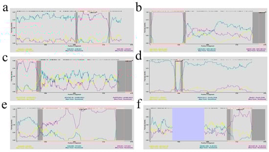 Potential recombination events in the NSP2 gene as detected using RDP (Version 4.101). The horizontal axis indicates the position in alignment, while the vertical axis illustrates pairwise identity. Panels (a−f) correspond to the RDP software predictions for each recombinant strain in Table 3, respectively.