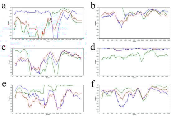 Verification of recombination events in the NSP2 gene through SimPlot (Version 3.5.1). The horizontal axis denotes the position, and the vertical axis signifies the percentage of permuted trees. Panels (a–f) correspond to the validation results of SimPlot software for recombination events for each recombinant strain in Figure 4, respectively. The main parental strain is depicted by the blue line, the minor parental strain by the green line, and the control strain by the red line.