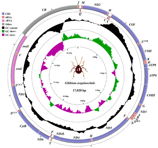 The mitogenome of G. aequinoctiale is 17,020 bp in length. This mitogenome contains a set of 37 representative metazoan mitochondrial genes (comprising 13 PCGs, 22 tRNAs, and two rRNAs) and a major non-coding region (CR, 2490 bp), which is situated in the interspace of small rRNA subunits (rrnS) and trnI (Figure 1 and Table 2). The mitogenome arrangement is shown in Figure 1 and appears identical to most other coleopteran mitogenomes. In contrast to the minority strand, which encodes 14 genes, the majority strand encodes 23 genes.