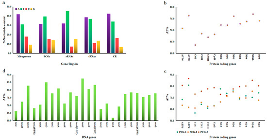 The overall adenine–thymine (A + T) content across the entire mitogenome is 72.8% (A = 41.9%; T = 30.9%; C = 18.0%; G = 9.2%) on the majority strand (Figure 2a). The nucleotide composition displayed different strand bias patterns in the G. aequinoctiale mitogenome. PCGs and rRNAs demonstrated moderate T-skew, while tRNA genes and the CR exhibited A-skew. By contrast, PCGs displayed a marginal C-skew, the CR exhibited a prominent C-skew, and rRNAs and tRNAs demonstrated distinct G-skew (Figure 2a).