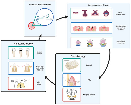 A more profound understanding of basic sciences provides clinicians with an opportunity to advise patients in the best way possible [12]. Both oral developmental biology and oral histology, when built upon the knowledge of their genetic background, become highly relevant for dental clinical aspects such as oral pathology, oral surgery, prosthodontics, orthodontics, and restorative dentistry (Figure 1).