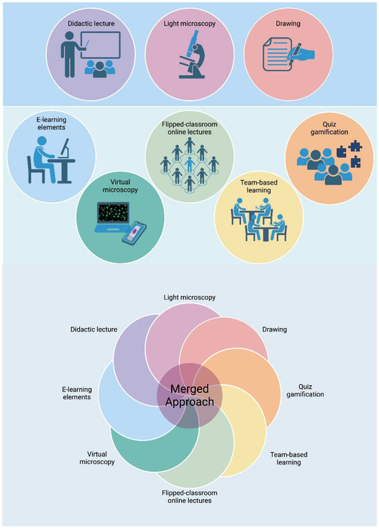 In conclusion, instead of deciding on using one or a few tools for teaching histology, one should imply a method that merges different teaching methodologies (Figure 2). In our opinion, by merging several techniques into the same course of histology, we can obtain a deeper understanding of the interdisciplinary related to histology, such as tissue development, pathologies, and genetics.