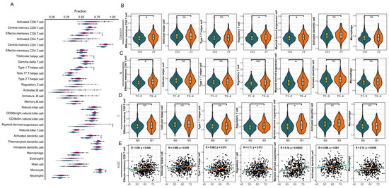 Immune infiltration. (A) Violin plot showing the infiltration levels of 28 immune cells in the high and low ssGSEA score groups. (B–D) Relationships between significantly different immune cells and clinical features (N, T stage, and Gleason grade). (E) Relationships between significantly different immune cells and the clinical feature AGE. The red line indicates the linear regression fit, and the blue shaded area represents the 95% confidence interval. The notations * and *** denote p < 0.05, and 0.001, respectively, while “NS” indicates p > 0.05.