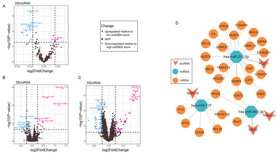 Construction of the ceRNA network. (A–C) Volcano plots showing the differential expression of lncRNAs, miRNAs, and mRNAs (pink indicates upregulated relative to low ssGSEA score, blue indicates downregulated relative to high ssGSEA score). In the volcano plot, the horizontal dashed line represents the statistical significance threshold, and the vertical dashed line indicates the fold change threshold. (D) ceRNA network (blue represents miRNA, red represents lncRNA, orange represents mRNA).